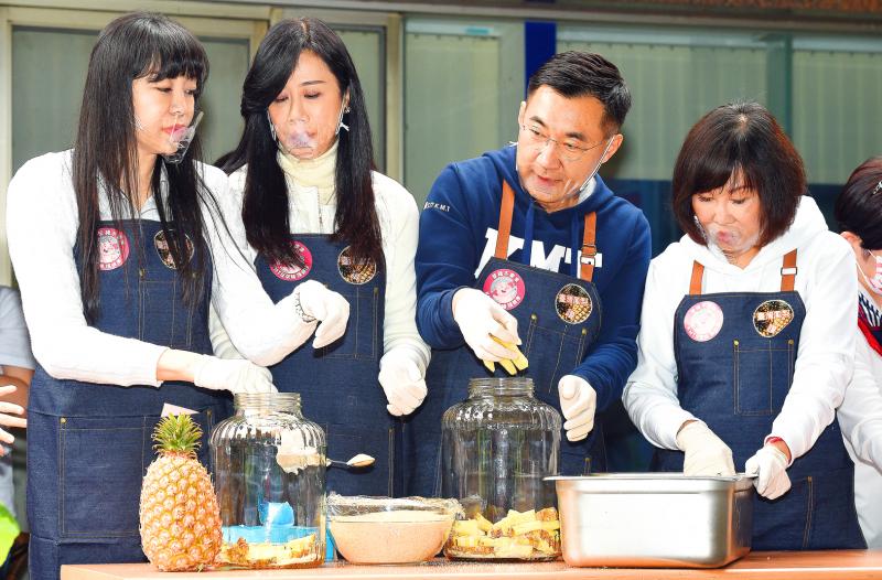 The KMT would help to ensure food safety, he said, before leading a group of KMT members in reading a pledge to “support Taiwanese pork, Taiwanese cabbage [and] Taiwanese pineapples.”
