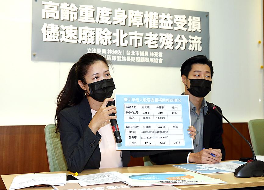 Taipei has since 2002 offered separate subsidies for elderly people with disabilities, independent Legislator Freddy Lim (林昶佐) and Taipei City Councilor Sabrina Lim (林亮君) told a news conference at the Legislative Yuan in Taipei.
