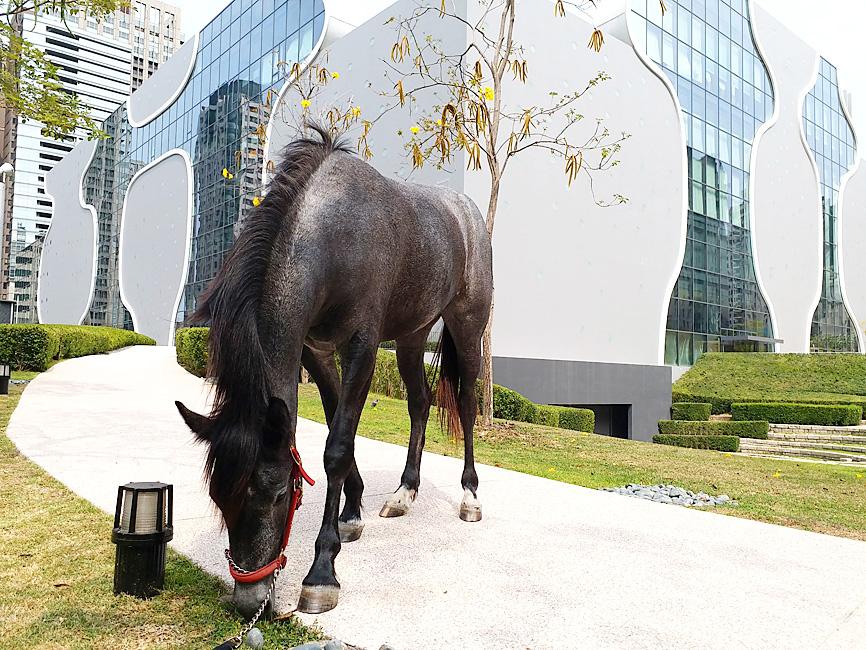 The Taichung Construction Bureau said that on Sunday it responded to a report of a man with a horse in Charlotte Park (夏綠地公園) near the National Taichung Theater.