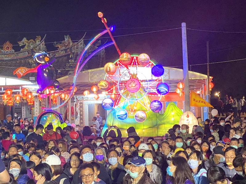 People stand next to one of the two main lanterns displayed at yesterday’s opening of the Kinmen Light Festival. The festival, which runs through May 30, showcases 71 lantern sets that were supposed to be exhibited at this year’s Taiwan Lantern Festival, which was canceled due to the COVID-19 pandemic. This is the first time that such a festival has been held on an outlying island.