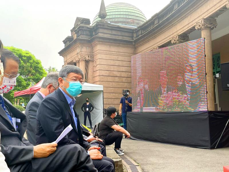 Taipei Mayor Ko Wen-je, second left, and guests attend a ceremony at the Taipei Water Park yesterday to unveil a statue of British engineer William Burton, who helped modernize Taiwan’s sewers at the end of the 19th century. Representative to Japan Frank Hsieh and Burton’s great-grandson attended via video link from Japan.