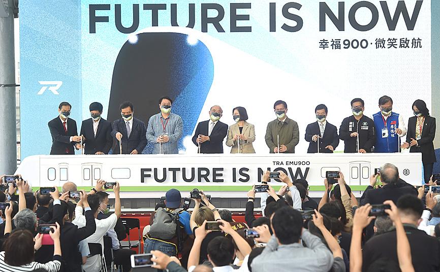 President Tsai Ing-wen (蔡英文), Premier Su Tseng-chang (蘇貞昌) and Minister of Transportation and Communications Lin Chia-lung (林佳龍) were among the government officials yesterday afternoon presiding over the train’s inauguration ceremony at Keelung Railway Station, the starting point of the nation’s trunk line.