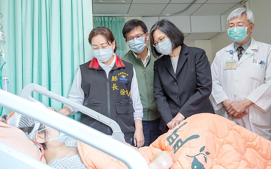 President Tsai Ing-wen (蔡英文) and other officials yesterday visited people injured in the Taroko Express No. 408 train crash, as well as the families of those who died in the accident.