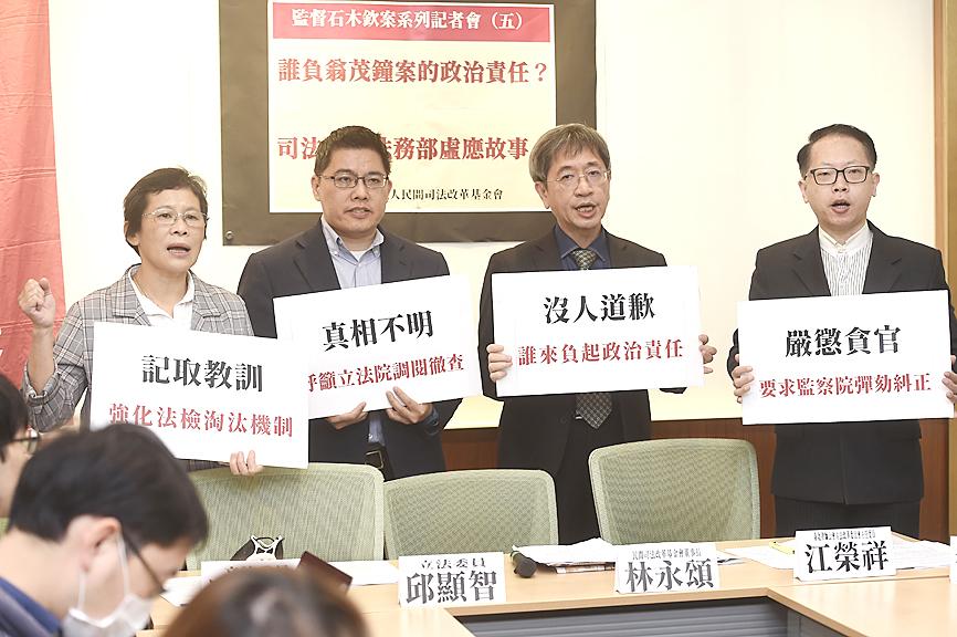 Judicial Reform Foundation chairman Lin Yung-sung (林永頌), and NPP legislators Chiu Hsien-chih (邱顯智) and Chen Jiau-hua (陳椒華) told a news conference in Taipei that they were disappointed with the content of the reports into the results of a second-stage investigation into the scandal.