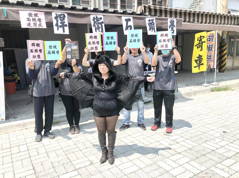 Independent Pingtung County Councilor Chiang Yueh-hui, center, wears a bat costume as she and other campaigners outside Fangliao Station in Pingtung County yesterday petition against a photoelectric factory being built near a World War II Japanese fort at Shihtouying. The fort’s underground tunnels are inhabited by several bat species.