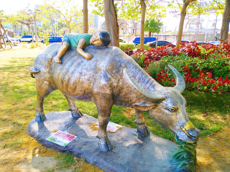A sculpture titled “Little Shepherd Boy,” evocative of a typical scene from 1940s rural Taiwan, is pictured outside the Tainan City Council building yesterday. Created by artists Wang Chao-wang and He Wen-chin, who are married, the installation is part of a series of works of art sponsored by the Tainan City Council on display inside and outside the building from today until May 22.