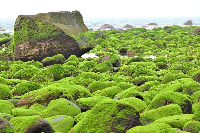 Laomei Green Reef (老梅綠石槽) in Shihmen District (石門) is a popular destination for its distinctive rock formations carved through erosion and coated in a bright green layer of sea lettuce.