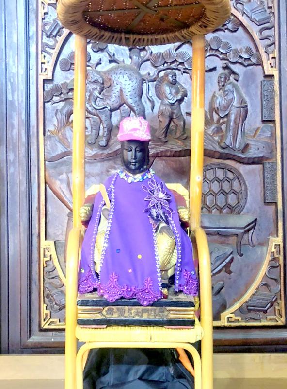 The statute of the goddess, affectionately known as Kaji Ma (開基媽), was shown sitting on a special woven rattan throne wearing a visored hat and robe on top of a covered rattan litter in a photograph.