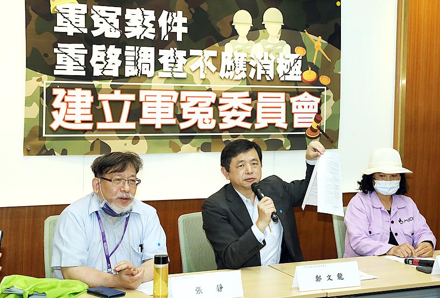 Association chairman Jerry Cheng (鄭文龍) presided over a news conference at the Legislative Yuan in Taipei yesterday, along with attorney and former judge Chang Ching (張靜), and Yu Jui-min (尤瑞敏), the mother of air force staff sergeant Tsai Hsueh-liang (蔡學良).