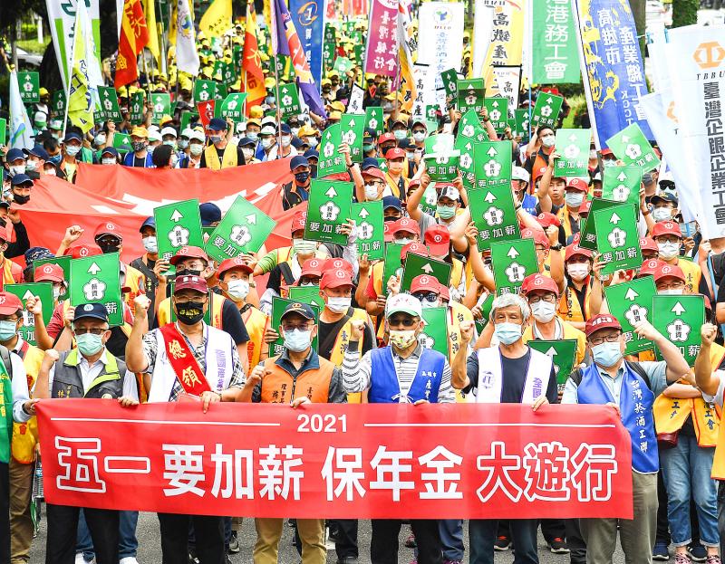Labor groups yesterday marked International Workers’ Day with a march through Taipei, while groups focused on pushing a higher minimum wage and guaranteed worker pension plans.