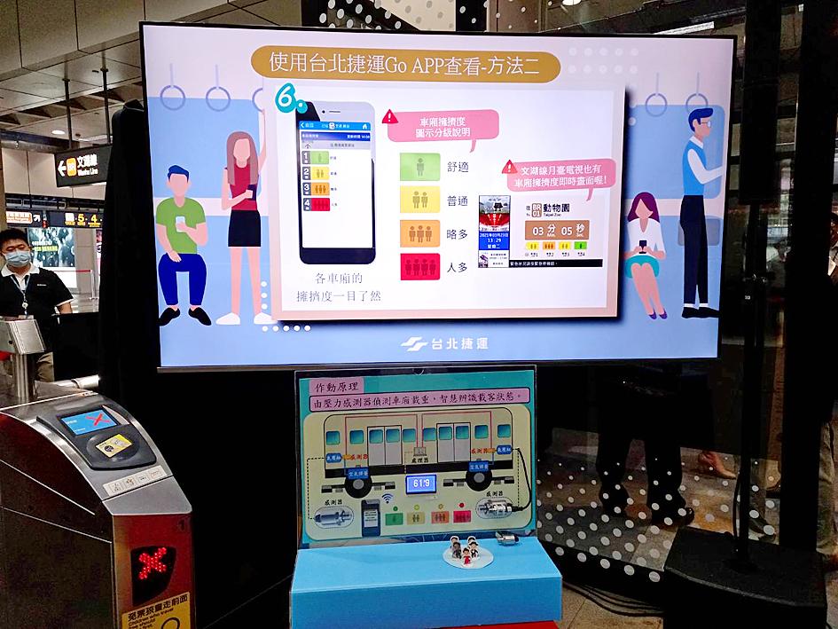 Passengers of Taipei MRT System’s Wenhu Line (Brown Line) can check how crowded the carriages are using the Taipei MRT app, as well as displays in the stations, Taipei Rapid Transit Corp (TRTC) said yesterday.