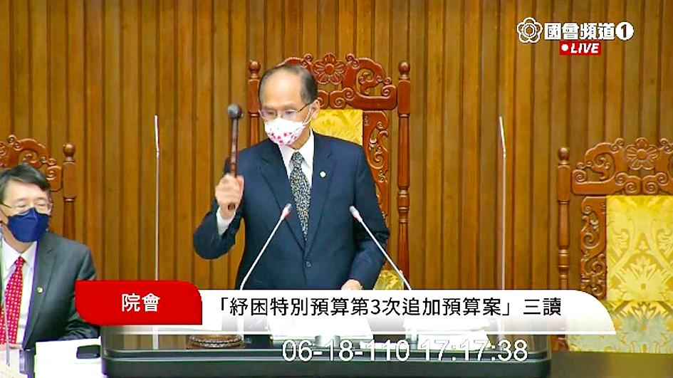 Legislators yesterday approved a NT$259.49 billion (US$9.33 billion) special budget for COVID-19 relief, the fourth such measure to fund epidemic prevention efforts and provide subsidies to people and businesses affected by the COVID-19 pandemic.