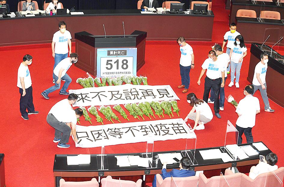 The KMT caucus’ calls to review emergency use authorization approvals for vaccines, establish a commission for compensation, and issue NT$10,000 in cash subsidies per person, NT$2.8 million to family members of those who have died from the virus and NT$150,000 to people confirmed to have contracted the disease were also rejected.