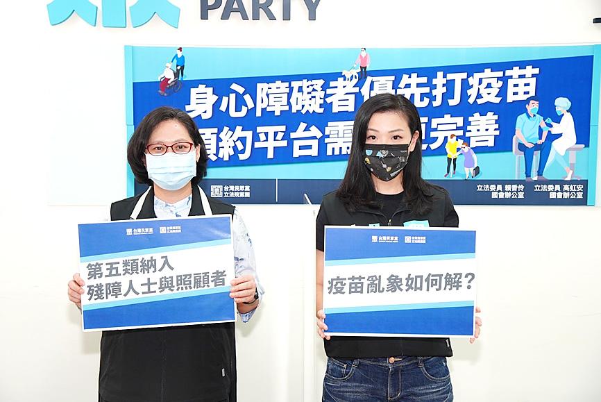 Taiwan has more than 1.2 million people with physical or mental disabilities, but most of them are not eligible for a COVID-19 jab under groups 5 and 9 of the Central Epidemic Command Center’s (CECC) vaccine priority list, Lin Chin-hsing (林進興), chairman of the Taoyuan-based Spinal Cord Injury Development Center, told an online news conference organized by Taiwan People’s Party legislators Lai Hsiang-ling (賴香伶) and Ann Kao (高虹安).