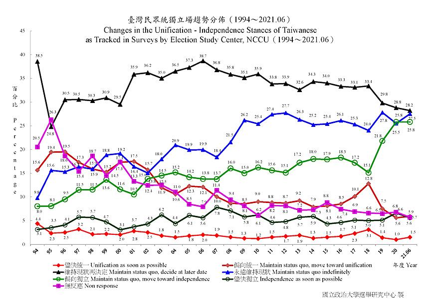 The results reflect changes in attitudes since 1994 among Taiwanese toward independence and unification with China, as well as self-identification trends since 1992, commenters said.