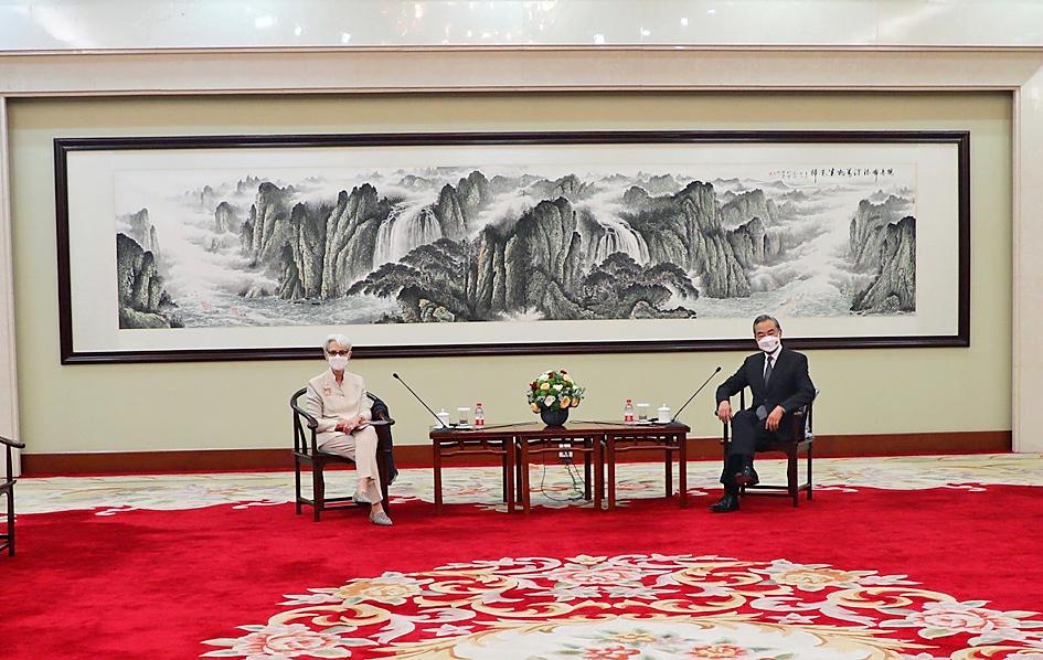 Sherman met with Chinese Minister of Foreign Affairs Wang Yi (王毅) on a visit to Tianjin on Sunday and Monday, with Wang urging Washington not to infringe on China’s sovereignty and territorial integrity.