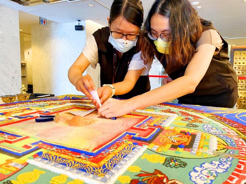 The mandala was created by Taiwan-based Tibetan monk I Hsi Sang-chu (義喜桑珠) in the sixth-floor hall of the museum in Yonghe District (永和), Cho said.