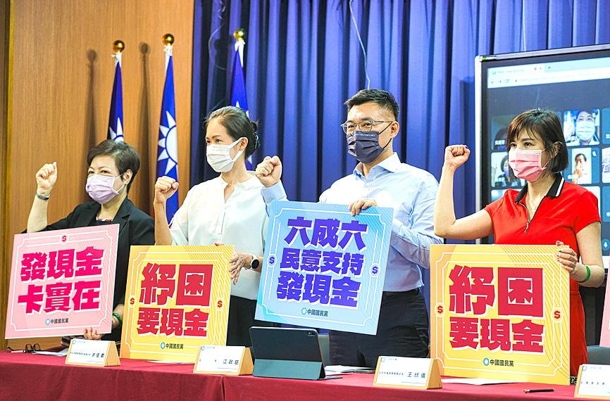 The Chinese Nationalist Party (KMT) and representatives from its city and county council caucuses yesterday again urged the government to adopt a universal cash handout scheme as a COVID-19 relief measure, saying that it would be more effective than a proposed stimulus voucher program.