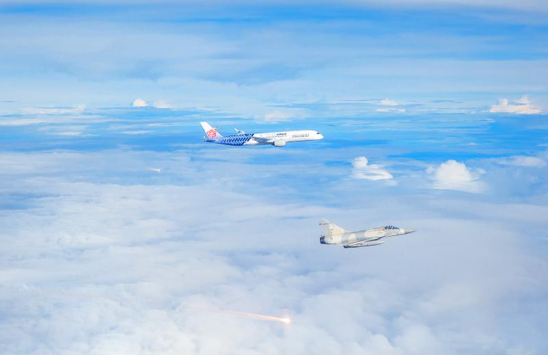 The four Mirage jets took off from Hsinchu Air Base to meet the athletes’ flight in the air before it touched down at 5:11pm.