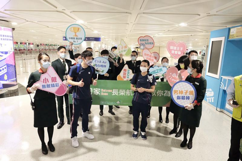 Representatives from the Sports Administration and Chinese Taipei Olympic Committee, as well as China Airlines and EVA Airways staff, also lined up to welcome the badminton team at Taiwan Taoyuan International Airport with banners and cheers.