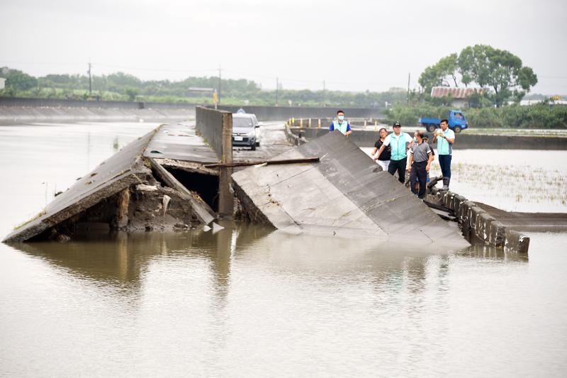 In the morning, 150mm of rainfall was recorded within three hours on Pingtung’s Hengchun Peninsula (恆春半島), causing flooding that blocked roads.