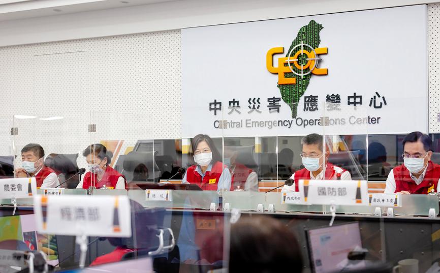 In a meeting at the Central Emergency Operations Center yesterday, President Tsai Ing-wen (蔡英文) asked government officials to quickly offer relief funding to affected farmers sustaining financial losses, adding that the COA and the Ministry of Economic Affairs should monitor the market.