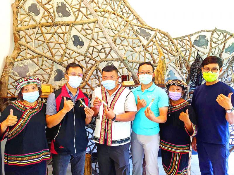 Bunun people in Nantou County’s Sinyi Township yesterday promote perfume they have made from “Litsea cubeba,” known by its Aboriginal name, makauy. Guided by the Forestry Bureau and Sun Moon Lake National Scenic Area Administration, the Bunun are also offering classes to teach people about makauy and Aboriginal culture.