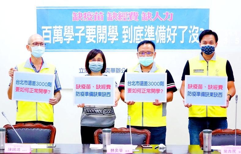 The most up-to-date statistics from the Taipei City Government show that there are 10,528 faculty members who require an additional dose to be fully vaccinated, but that it only received 5,800 doses from the central government, KMT Legislator Lin Yi-hua (林奕華) told a news conference in Taipei.