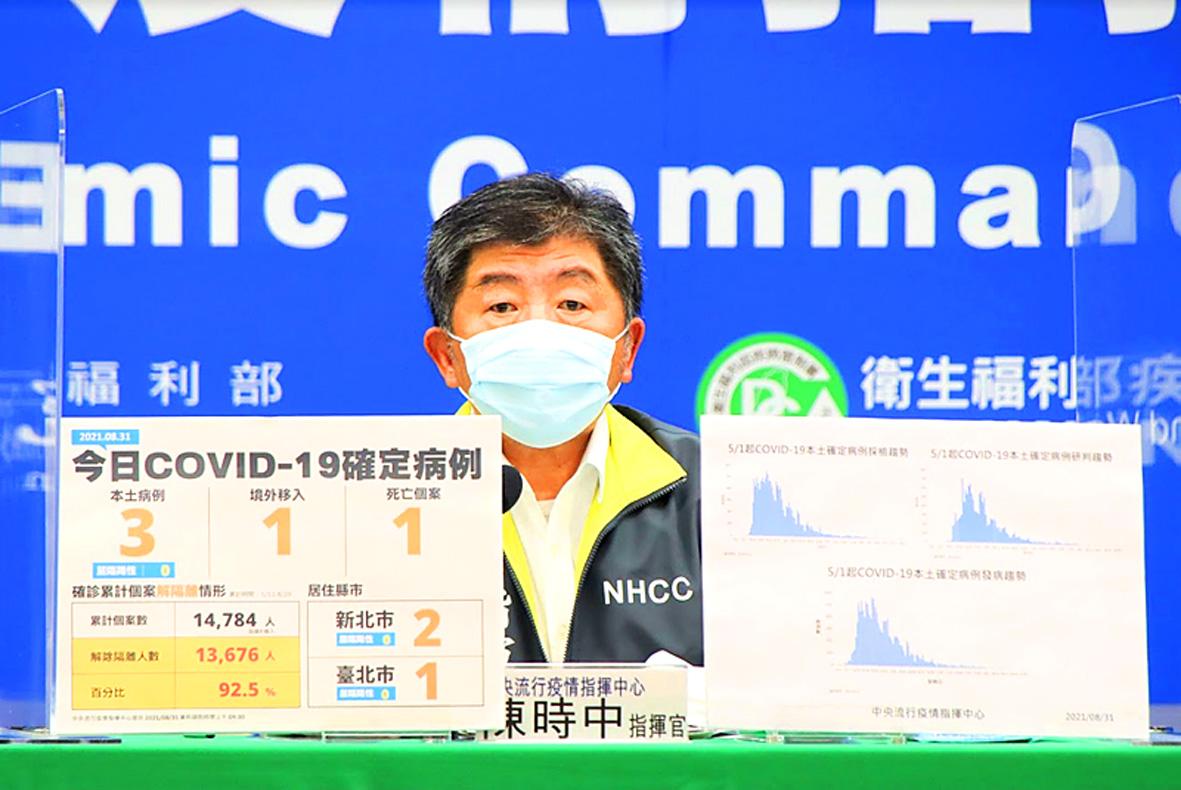 The Central Epidemic Command Center (CECC) yesterday reported three local COVID-19 cases, one imported case and one death. It also said that tests conducted on the close contacts of a breakthrough infection were negative.