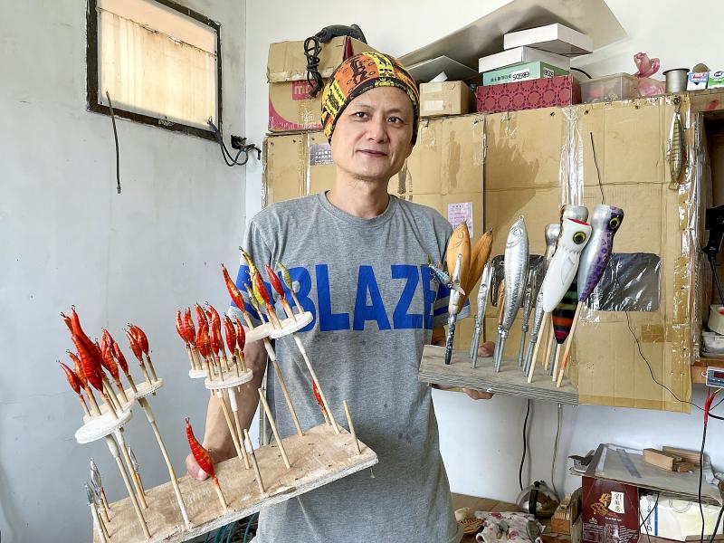 Wang Tsung-lieh (王聰烈) said that his love of fishing motivated him to make lures for a living, adding that he makes them only with wood to prevent damage to the marine environment.