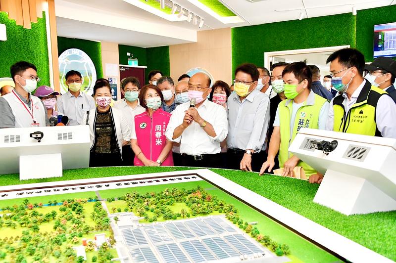 Minister of Economic Affairs Wang Mei-hua, Democratic Progressive Party (DPP) Legislator Chou Chun-mi, Premier Su Tseng-chang, Pingtung County Commissioner Pan Meng-an, DPP Legislator Chuang Jui-hsiung and Council of Agriculture Minister Chen Chi-chung, front row, second to seventh left, inspect a model of the Donghaifeng Agricultural Circular Park in Pingtung County yesterday.
