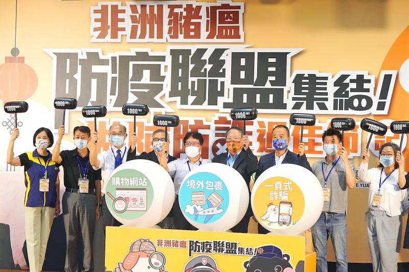 Customs Administration deputy head Chen Yi-tsai, fourth left, and other officials at a news conference in Taipei yesterday to raise awareness of African swine fever hold mock sledgehammers to express their determination to end the smuggling of pork products into Taiwan. The agency said that from next year it would tighten checks for the disease on all goods imported via air cargo from high-risk countries. Each item sent via air, including express mail, is to be inspected at its point of entry, Chen said.