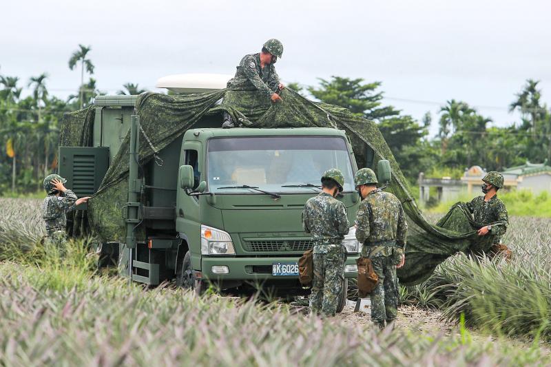 The military vehicles transported personnel and equipment to designated tactical positions near Hualien Air Base to form a defensive line to eliminate enemy troops expected to invade the country from the east.