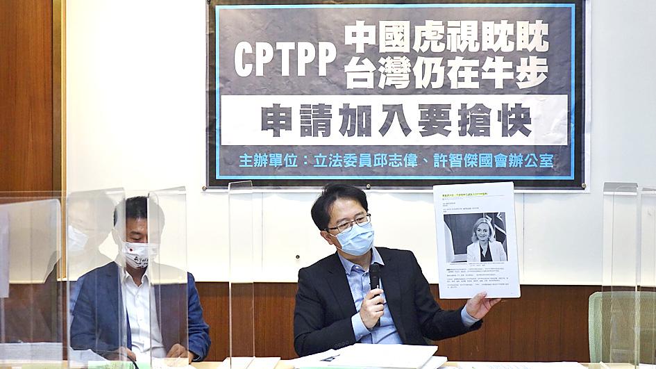 Taiwan would lose its shot at joining if China joins the pact, DPP Legislator Chiu Chih-wei (邱志偉) told a news conference at the Legislative Yuan in Taipei.