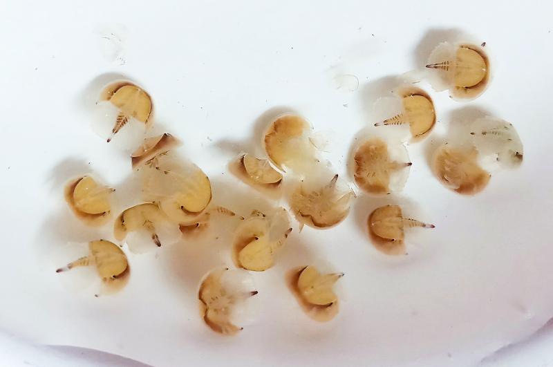 After hatching, the larvae swim in the ocean for about six days before settling in shallow intertidal waters, where they feed at low tide.