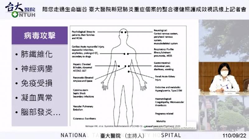 NTUH Department of Physical Medicine and Rehabilitation attending physician Liang Huey-wen (梁蕙雯) said that SARS-CoV-2 not only attacks the lungs, but also affects the nervous system and immune system, as well as causing abnormal blood clotting and brain inflammation.