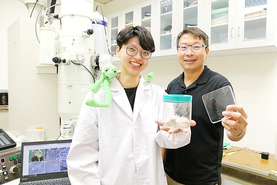 By observing how frog skin prevented algae from growing, the team developed a material to stop microbes, barnacles and mussels from growing on ships, which not only make the vessels appear dirty, but can cause structural damage, said materials science and engineering associate professor Hsueh Han-yu (薛涵宇), who led the team.