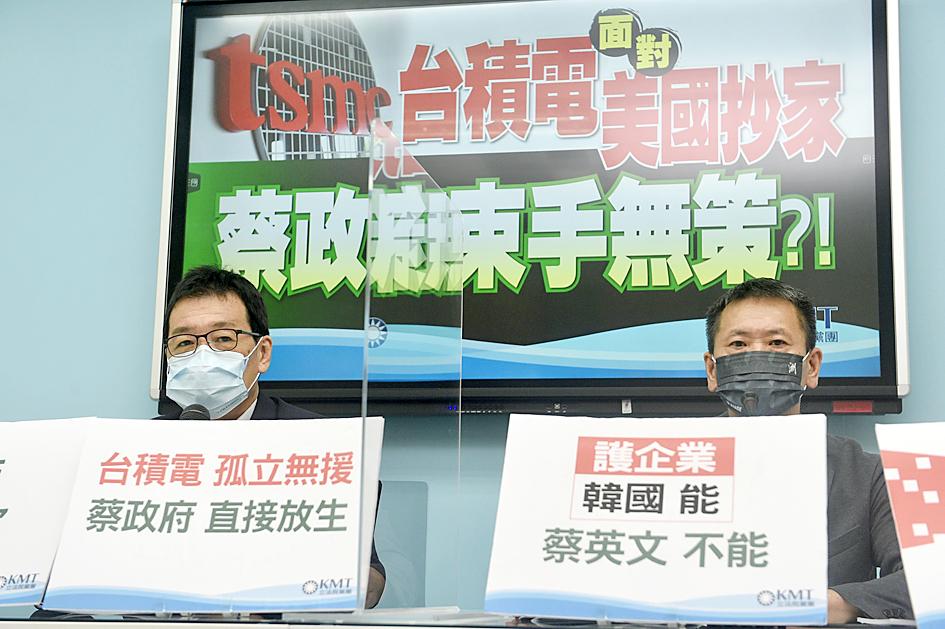 The Tsai administration and Minister of Economic Affairs Wang Mei-hua (王美花) are willing to sacrifice TSMC’s interests to comply with the US’ wishes, the KMT caucus told a news conference in Taipei.