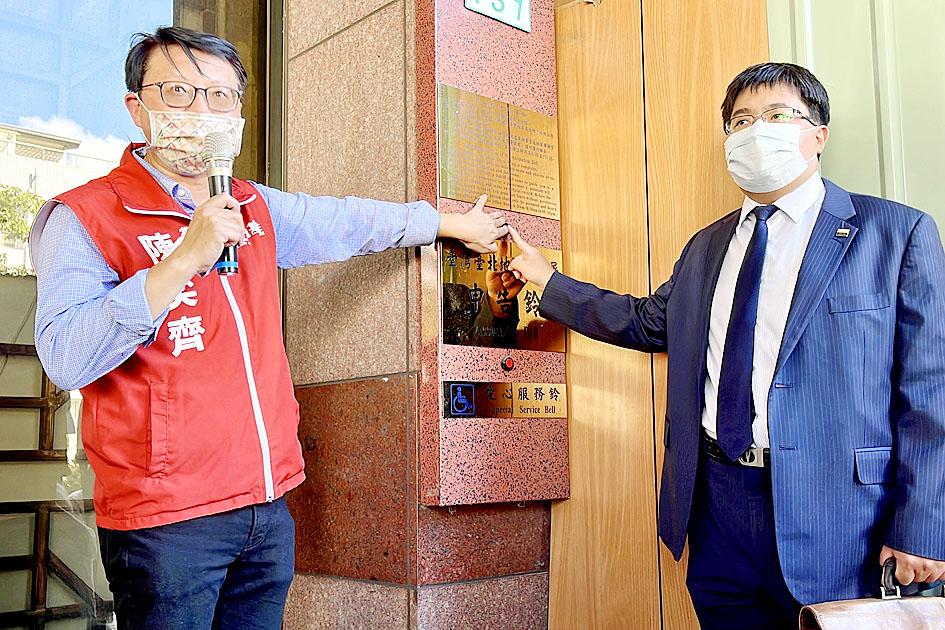 Accompanied by attorney Huang Di-ying (黃帝穎), Chen Yi-chi filed a complaint with the Taipei District Prosecutors’ Office, asking prosecutors to investigate whether Chu had breached the Civil Servants Election and Recall Act (公職人員選舉罷免法) by spreading false information.