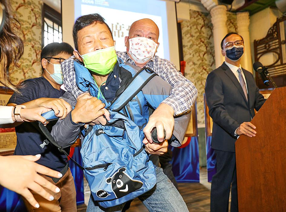 At one point when Chu was speaking at the podium, Taiwan Republic Office director Chilly Chen (陳峻涵) approached the podium, raised a banner and shouted that Retrocession Day was “the day Taiwan fell back into enemy hands.”