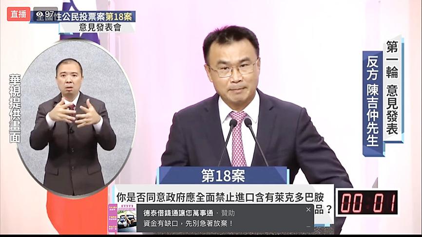 Chinese Nationalist Party (KMT) Legislator Lin Wei-chou (林為洲) and Council of Agriculture Minister Chen Chi-chung (陳吉仲) yesterday clashed over the benefits and drawbacks of banning imports of pork products containing ractopamine in the first televised presentation organized by the Central Election Commission ahead of a Dec. 18 referendum.