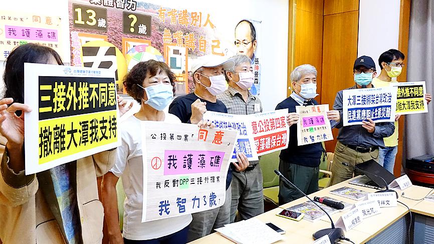 Members of the Taiwan Algae Reef Reservation Alliance, Air Clean Taiwan and the Changhua Medical Alliance for Public Affairs yesterday at a joint media briefing urged people to vote “yes” on a Dec. 18 referendum to relocate the terminal.