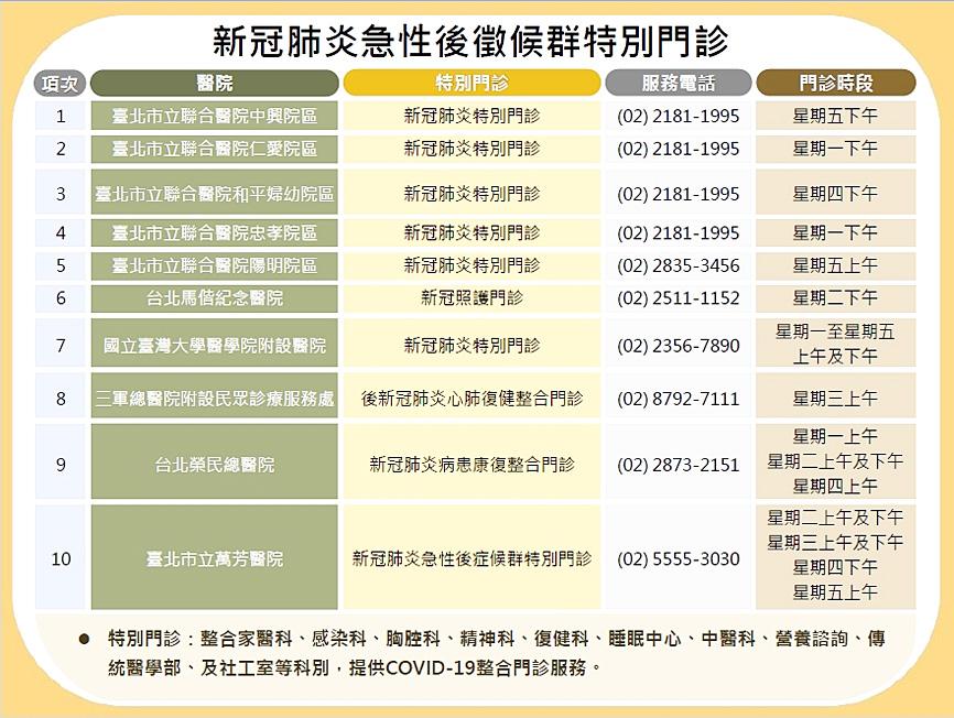 Ten hospitals in Taipei have each opened a special clinic to treat people with post-acute COVID-19 syndrome, the Taipei Department of Health said yesterday.