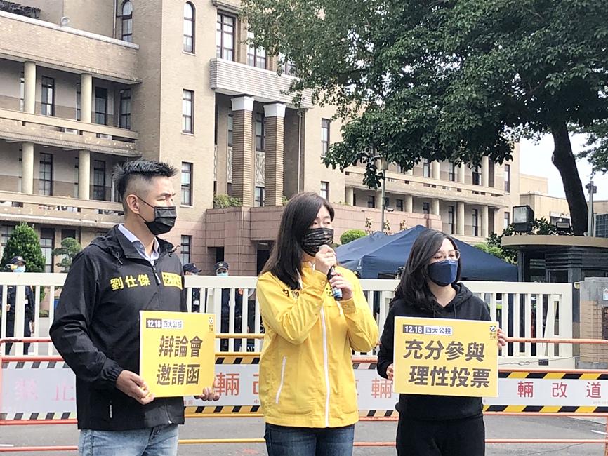 NPP spokeswoman Yu Chia-chien (余佳蒨), secretary-general Christy Pai (白卿芬) and Taipei headquarters deputy executive director Jerry Liu (劉仕傑) yesterday morning presented at the Executive Yuan an official invitation to a debate.