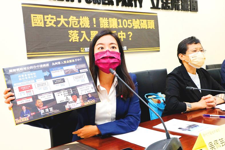 NPP deputy caucus whip Chen Jiau-hua (陳椒華) told a news conference that the No. 105 wharf is a strategically important infrastructure and the Taiwan International Port Co should ensure that it does not become a national security loophole by allowing a “corrupt” local faction leader like Yen to use it.