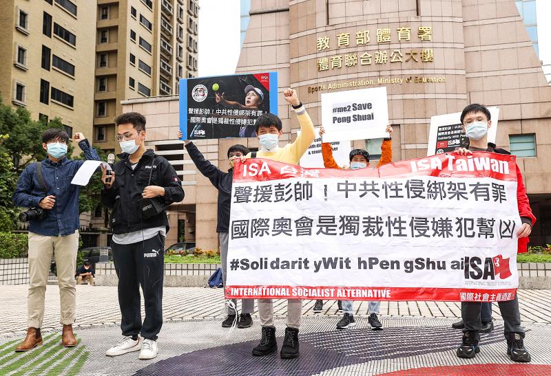 Members of International Socialist Alternative hold signs at a protest in front of the Sports Administration building in Taipei yesterday in support of Chinese tennis player Peng Shuai. Peng’s whereabouts and safety have become a matter of international concern after she early this month disappeared after she accused former Chinese vice premier Zhang Gaoli of sexual abuse.