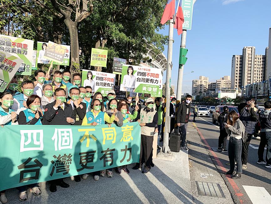 Near roads and streets in cities and counties across Taiwan, DPP members gathered to urge people to vote “no” on the questions.