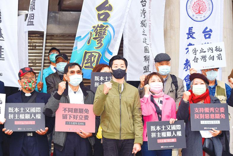 Yesterday’s event in support of Lim was led by the World United Formosans for Independence (WUFI) and the Taiwan New Constitution Foundation, and joined by Democratic Progressive Party Legislator Fan Yun (范雲) and Social Democratic Party Taipei City Councilor Miao Po-ya (苗博雅).