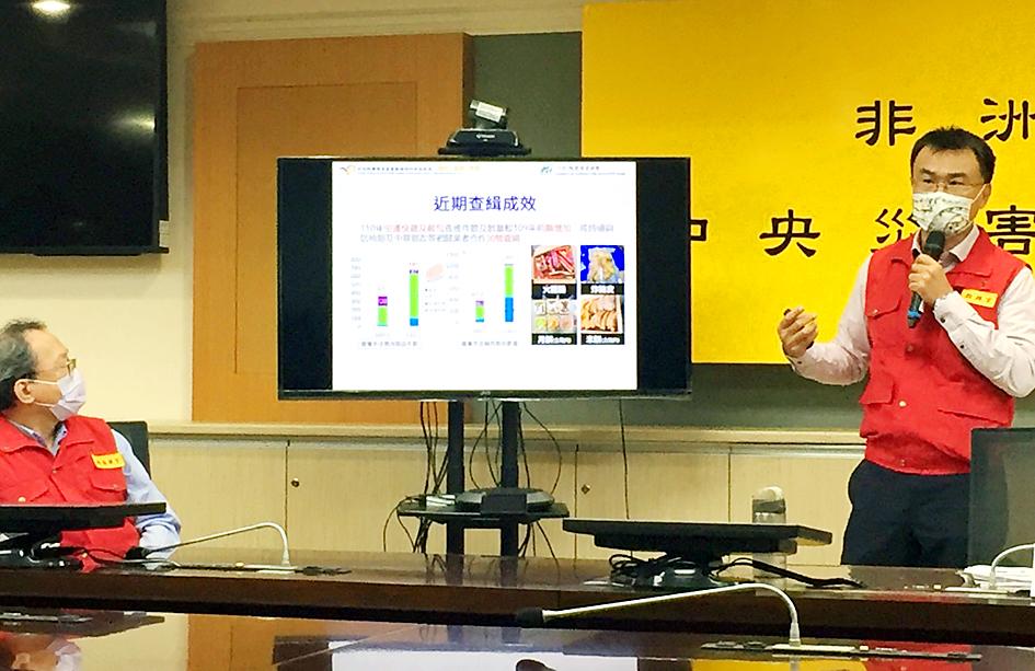 Council of Agriculture (CAO) Minister Chen Chi-chung (陳吉仲), who heads the center’s African swine fever prevention task force, said that pork products brought in by air and sea passengers have significantly dropped after the government imposed a NT$20,000 fine.