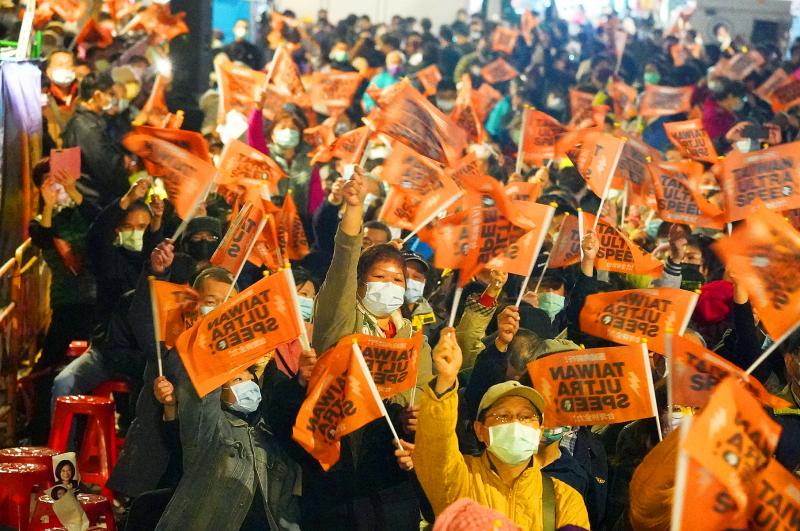 Rock band Sorry Youth (拍謝少年), rapper Dwagie (大支) and ballad singer Michael Shih (施文彬) performed outside Longshan Temple (龍山寺) at the rally hosted by Democratic Progressive Party (DPP) legislators Rosalia Wu (吳思瑤) and Tsai Yi-yu (蔡易餘).